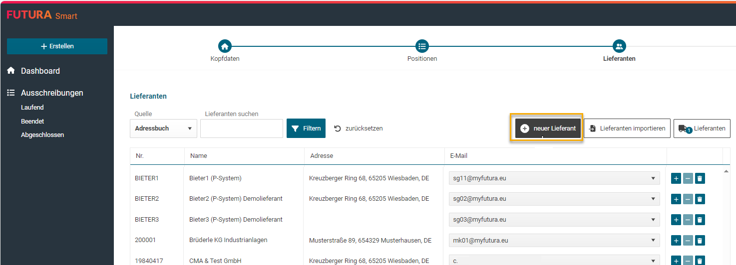 Einen neuen Lieferanten können Sie auch im Zuge des Erstellungsprozess einer Ausschreibung erstellen. Sobald Sie nach Pflege der Pflichtfelder in den Kopfdaten und Positionen zu Schritt 3 “Lieferanten” gelangen, verwenden Sie den Button “Neuer Lieferant” oberhalb der Auflistung.