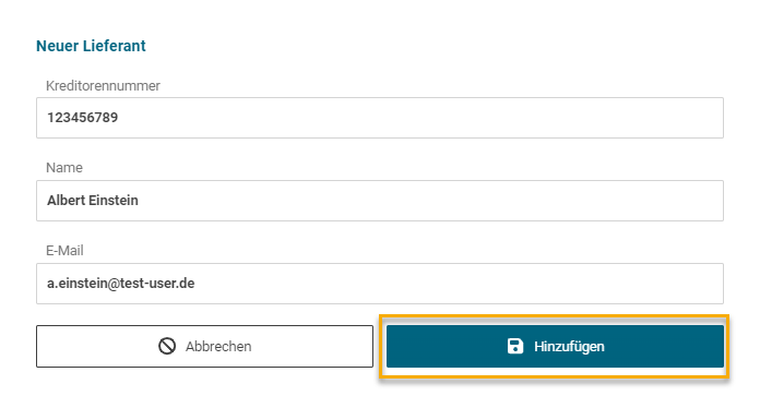 Klicken Sie abschließend auf "Hinzufügen" und der Lieferant wird dem FUTURA Smart Adressbuch hinzugefügt. Er steht ab dann Ihnen und allen Benutzern Ihrer Organisation zur Verfügung.
