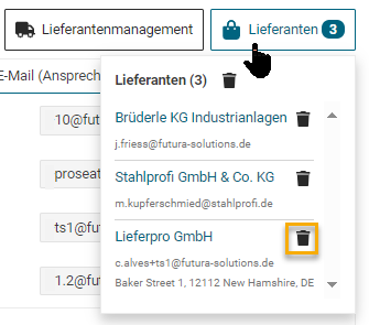 Nach dem Anlegen des neuen Lieferanten innerhalb einer Ausschreibung, wird das Unternehmen direkt zur Ausschreibung hinzugefügt. Dies können Sie im Warenkorb der Lieferanten einsehen. Mit dem Mülltonnen-Button können Sie diesen ggf. entfernen.