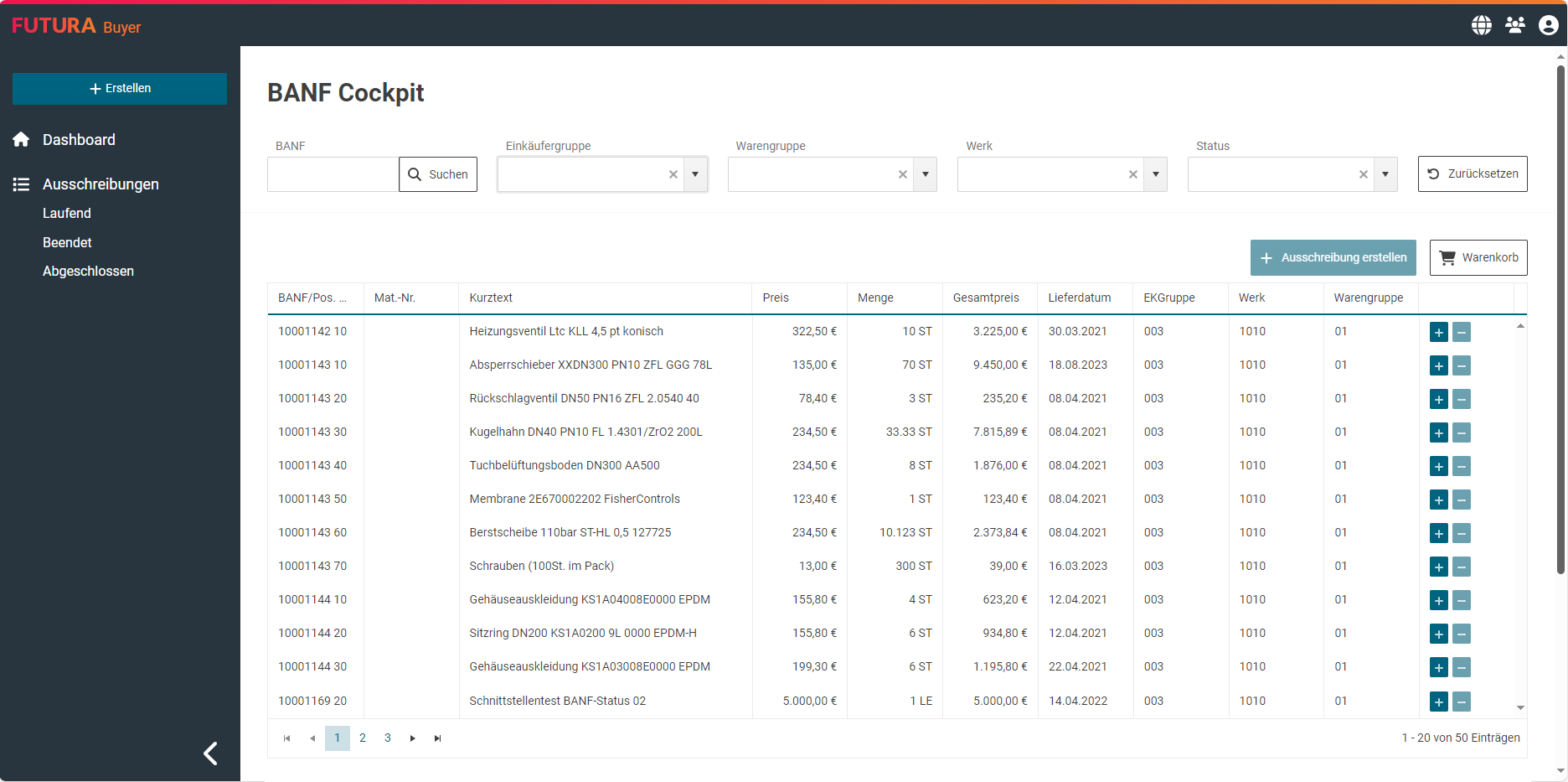 Wählen Sie mit dem “+”-Button auf der rechten Seite Ihre gewünschten BANF-Positionen aus. Diese werden dem Warenkorb hinzugefügt.
