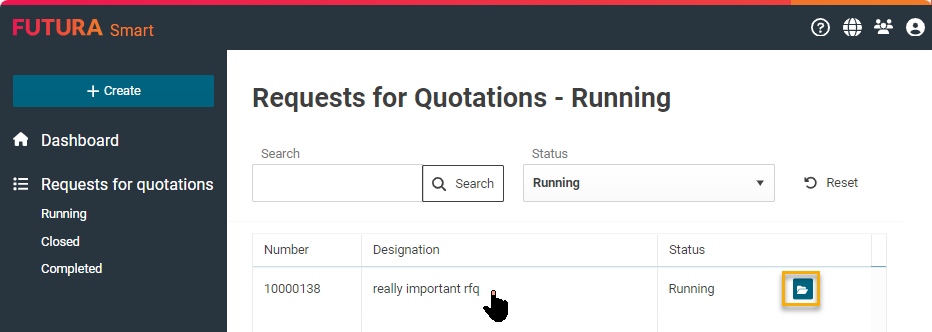 Select your desired request for quotation from the "Requests for quotation - ongoing" list. You can open the request for quotation by clicking anywhere in the line or on the right by using the envelope button.