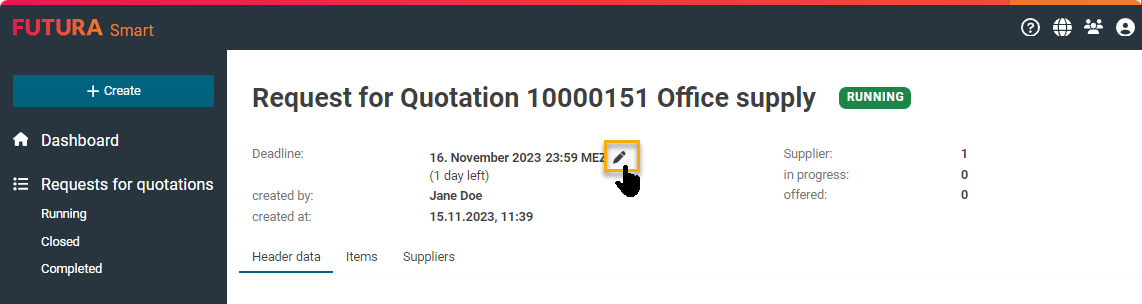 If necessary, you can change the submission deadline. You can take this measure if, for example, you want to give suppliers more time to prepare their quotations.