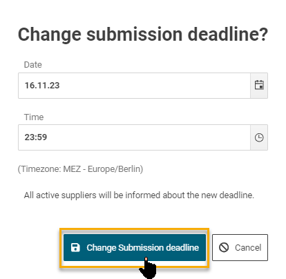 Finally, click on the button "Change Submission deadline". All active suppliers will then be notified by e-mail about the new deadline.