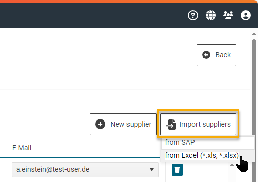 In the "Supplier Management" section, you can import several supplier records via Excel. The suppliers are created in FUTURA Smart and can then be used for your requests for quotation. Supplier records that you import via Excel are created in the address book of FUTURA Smart and can then also be used by other users of your organization. You should also maintain a SAP business number in the import file so that you can transfer these data records to the SAP system with (e.g.) a purchase order.