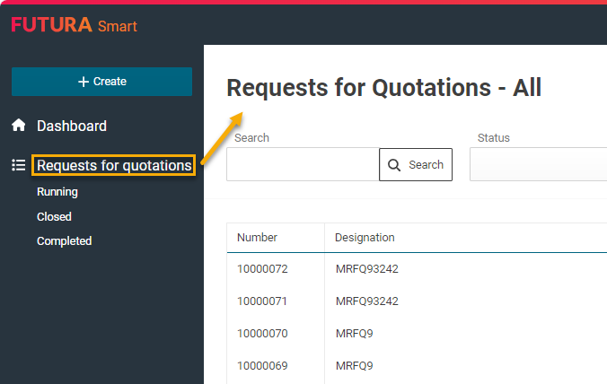 Under the menu Requests for quotation "Ongoing", you can display the currently running requests. Transactions with this status have not yet reached their submission deadline.