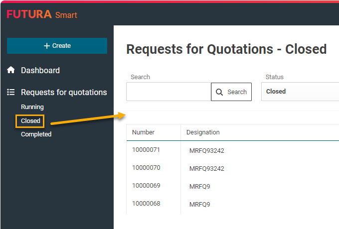 Requests that are in the status "Closed” have reached the submission deadline. If there are quotations, a quotation opening may either have already been carried out or the opening is still to be done. You can carry out this action at this time or start further quotation rounds (negotiations). After the quotation opening has been carried out, the quotation prices can be evaluated in the price comparison list and orders and/or contracts can be created from them. These are then send and created in SAP.