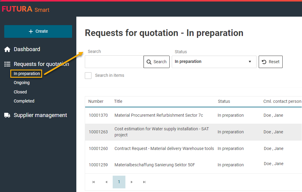 A request is automatically created as soon as you switch from the "Header data" to the "Items" step in the creation process. In this case, the request is given the status "In preparation".