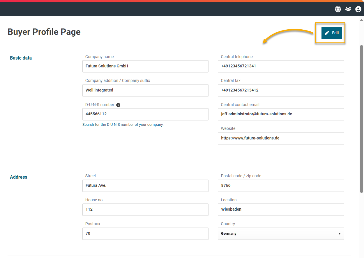 Clicking on “Company profile”, the data sheet of your company is displayed. You can change or update the company data as needed with the "Edit" button in the upper right corner.