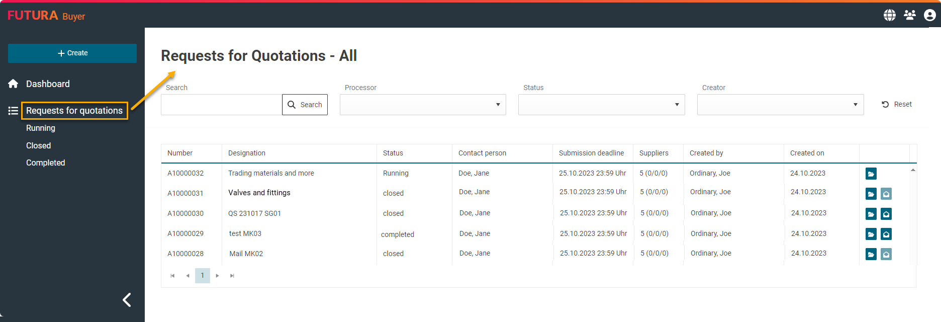 Accedere all'elenco "offerte" (elenco completo) o all'elenco " offerte" → "chiuse". Nella panoramica globale delle richieste (ad esempio), vengono visualizzati tutti gli stati delle richieste.