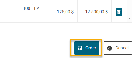 Klik op de knop "Bestel aanmaken" om een dialoogvenster te openen waarin u de order kunt invullen. Voer hier de SAP-relevante informatie in zodat de order kan worden aangemaakt in SAP. Alle weergegeven velden zijn verplicht.