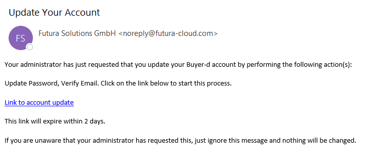 Wanneer het account nieuw is aangemaakt, ontvangt u de volgende e-mail, waarin u op "Link to account update" (link naar accountupdate) kunt klikken: