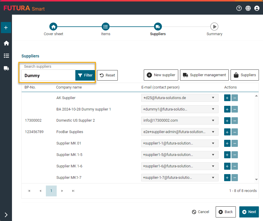 U kunt het hele FUTURA Smart adresboek als bron gebruiken, waarin ook leveranciersgegevens uit SAP zijn opgenomen voor het zoeken en toevoegen van leveranciers.