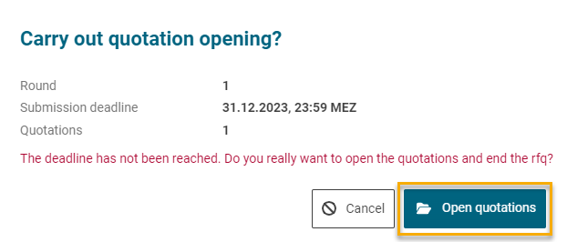 Otwarcie oferty powoduje również jej zamknięcie, jeśli termin składania ofert przypada w przyszłości (status "Trwający"). Termin składania ofert jest również automatycznie ustawiany na czas otwarcia oferty i od tego momentu dostawcy nie mogą już przetwarzać oferty.
