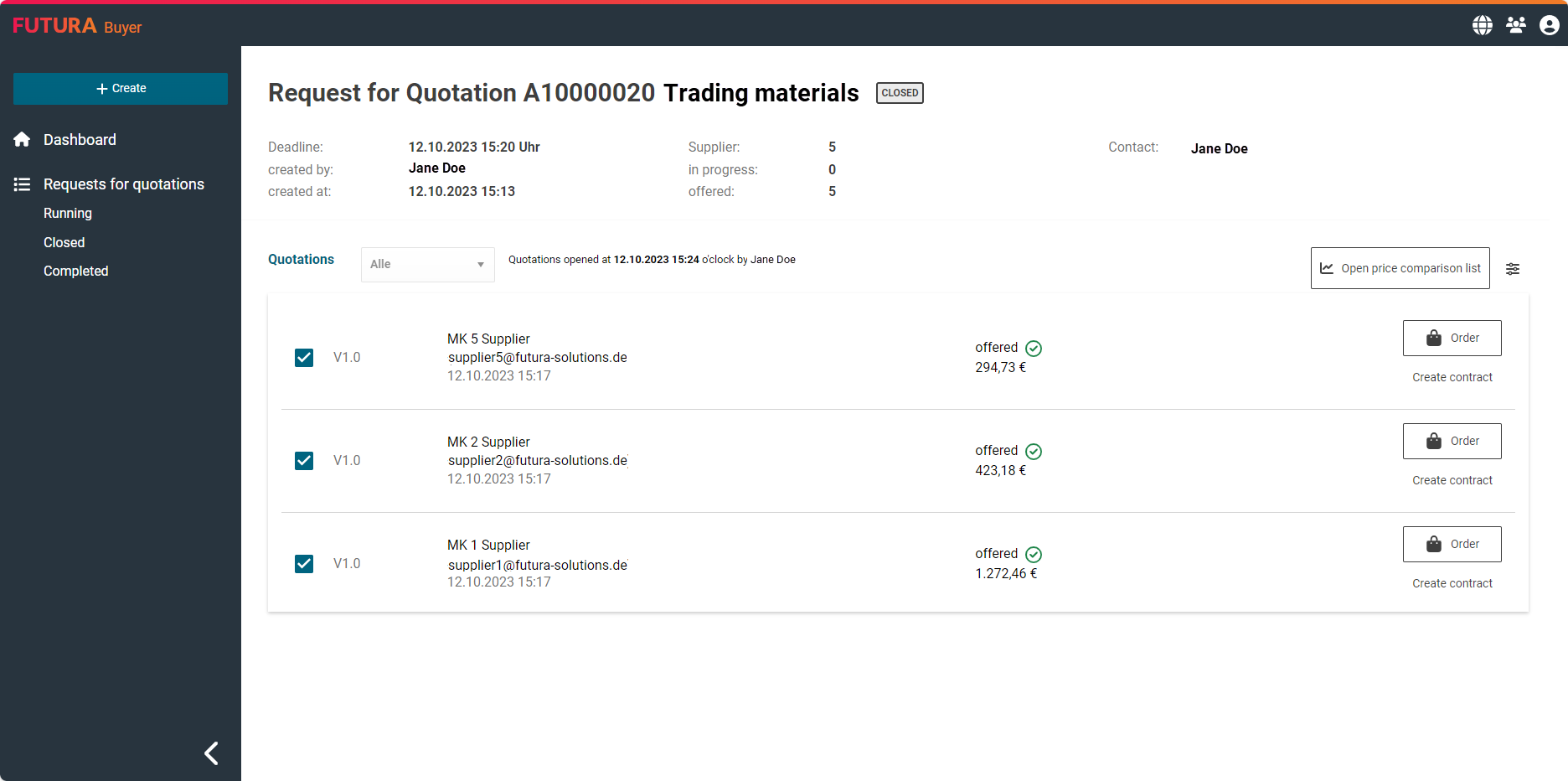 Com a abertura das cotações, você também encerra a solicitação de cotação, caso o prazo de envio ainda não tenha terminado (status "Em andamento"). Além disso, o prazo de entrega é automaticamente definido para o momento da abertura e não será mais possível para os fornecedores processar a solicitação a partir de esse momento.