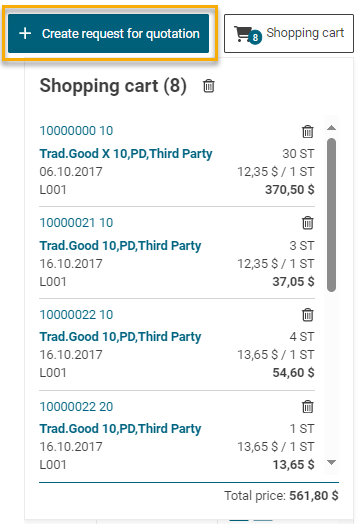 Quando o carrinho de compras estiver completo e correto, clique em "+ Criar pedido de cotação" à esquerda.