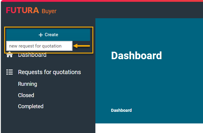 No dashboard (página inicial), você pode iniciar um novo processo clicando no botão "Criar" e na opção "Nova solicitação de cotação". Em seguida, você será guiado para o Cockpit de Requisição de Compras.